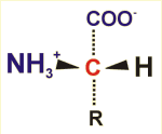 Die zwanzig verschiedenen Aminosäurebausteine der Proteine entsprechen allesamt der angegebenen Struktur mit zwanzig verschiedenen Resten R. Wegen der vier unterschiedlichen Gruppen am zentralen Kohlenstoffatom (rot) sind Aminosäuren chirale Verbindungen. Als Bausteine von Proteinen werden in diesem Zusammenhang nur Aminosäuren mit der dargestellten Anordnung genutzt, nicht die entsprechenden Spiegelbilder.
